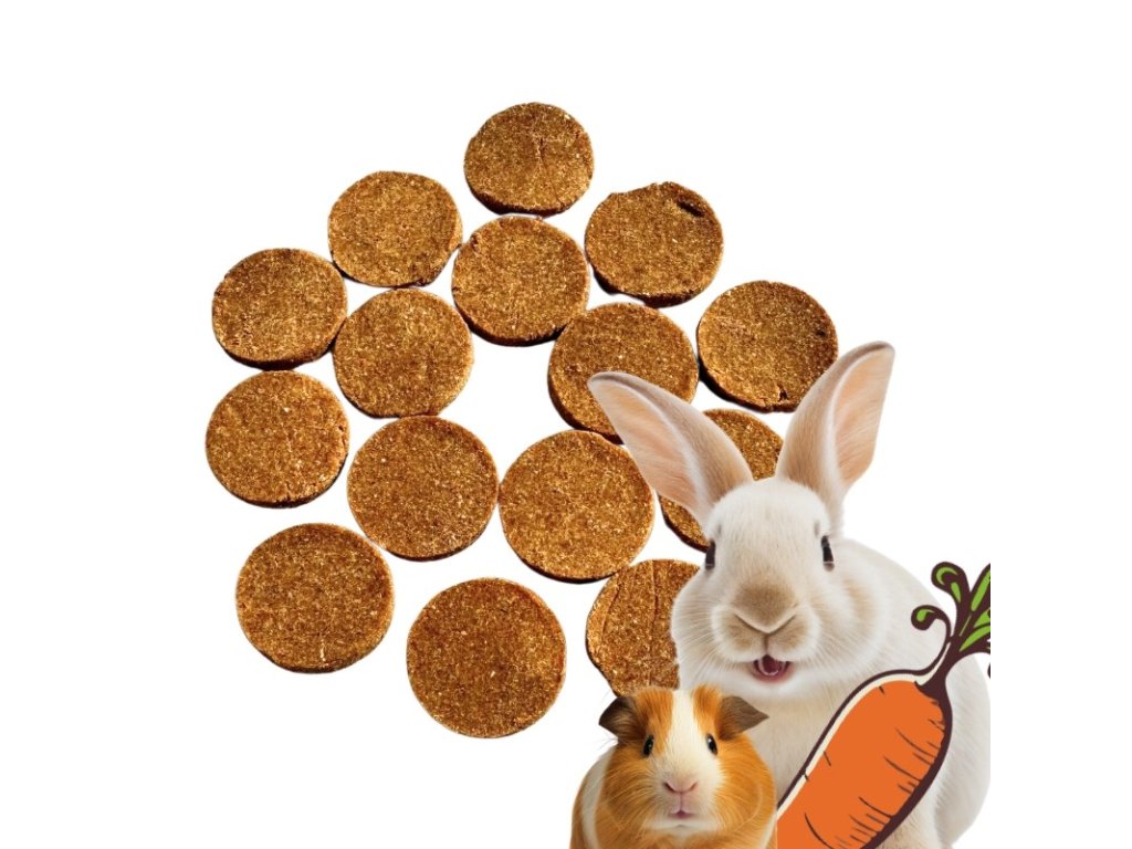 Mrkvové, přírodní, zdravé, bezobilné a ručně tvořené pamlsky, dukátky pro králíky a hlodavce (pro křečky, křečíky, morčátka, myši a potkany) jsou díky svému složení skvělým doplňkem jídelníčku Vašeho mazlíčka. V balení najdete 15 kusů, podávejte jako pamlsek. Mrkev je jedním z nejlepších zdrojů beta-karotenu, který se v organismu zvířat mění na vitamín A. Mrkev zvyšuje odolnost organismu, pomáhá při zácpách, posiluje srdce a cévy a podporuje vývoj a růst. Dukátky jsou sušeny při max. teplotě 40°C, aby byly zachovány vitamíny a cenné látky surovin. Pamlsek bez obsahu obilovin, barviv, hrachu, konzervantů a dalších nedobrých věcí.